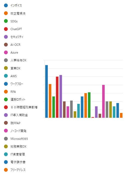 新型コロナウイルス感染症が5類感染症に移行されたということもあり、今年の展示会はたくさんのご来場を頂きました。 来場者の興味があるキーワードについては、 1位 インボイス制度 2位 セキュリティ 3位 ChatGPT という結果でした。 それぞれのブースやセミナーの様子は下記の通りです。 ■インボイス制度 インボイス制度のセミナーは早々に満員となり、その関心の大きさがうかがえました。 10月開始に備え、何かしらの対応策は進めつつありますが、制度面、運用面の不安も持たれているようです。 展示会を通じて、自社に適した商品があるかを探しつつ、 今考えている運用が正しいかを確認したいという目的で来られている企業様が多くいらっしゃいました。 ■セキュリティ ソフトやデータ保存のクラウド化が進む中、セキュリティに関しての興味関心は高い状態が保たれています。 セキュリティに関して、最新の情報を得ようとする方もいらっしゃれば、 ピコシステムのセキュリティブースへは「具体的に何から始めたらよいのか」という相談いただく方もいらっしゃいました。 ■ChatGPT 展示会ではMicrosoft Bing AIチャットを体験いただきました。 まだ具体的に業務に活用している企業様は少ないようでしたが、AI技術を会社にどう活かすか、 そしてその結果、生産性をいかに向上させるかについて前向きに考える企業様もいらっしゃいました。 セミナーを通じてMicrosoft 365 Copilotについても紹介させていただきましたが、何時間も時間をかけていた「資料作成・データ解析」 といった作業が一瞬で完了するということも実現間近にきています。 2日間通じて最新の機器や技術、生産性向上のためのITツールを多くご紹介させていただきました。 技術の進歩により業務の自動化や、効率化等、「こんな事もできるのか!」と驚かされた事も多かったかと思います。 業務改善のツールの選択肢は豊富ですが、重要なのはその中で自社に最適なITツールをどう選択するかです。 ツール選択でお悩みの際はピコシステムにご相談いただけましたら幸いです。 また、展示会には参加できなかったが、セミナー内容や展示物について情報が欲しいというお客様にも 担当営業から情報提供をさせて頂ております。どうぞお気軽にお申し付けくださいませ。