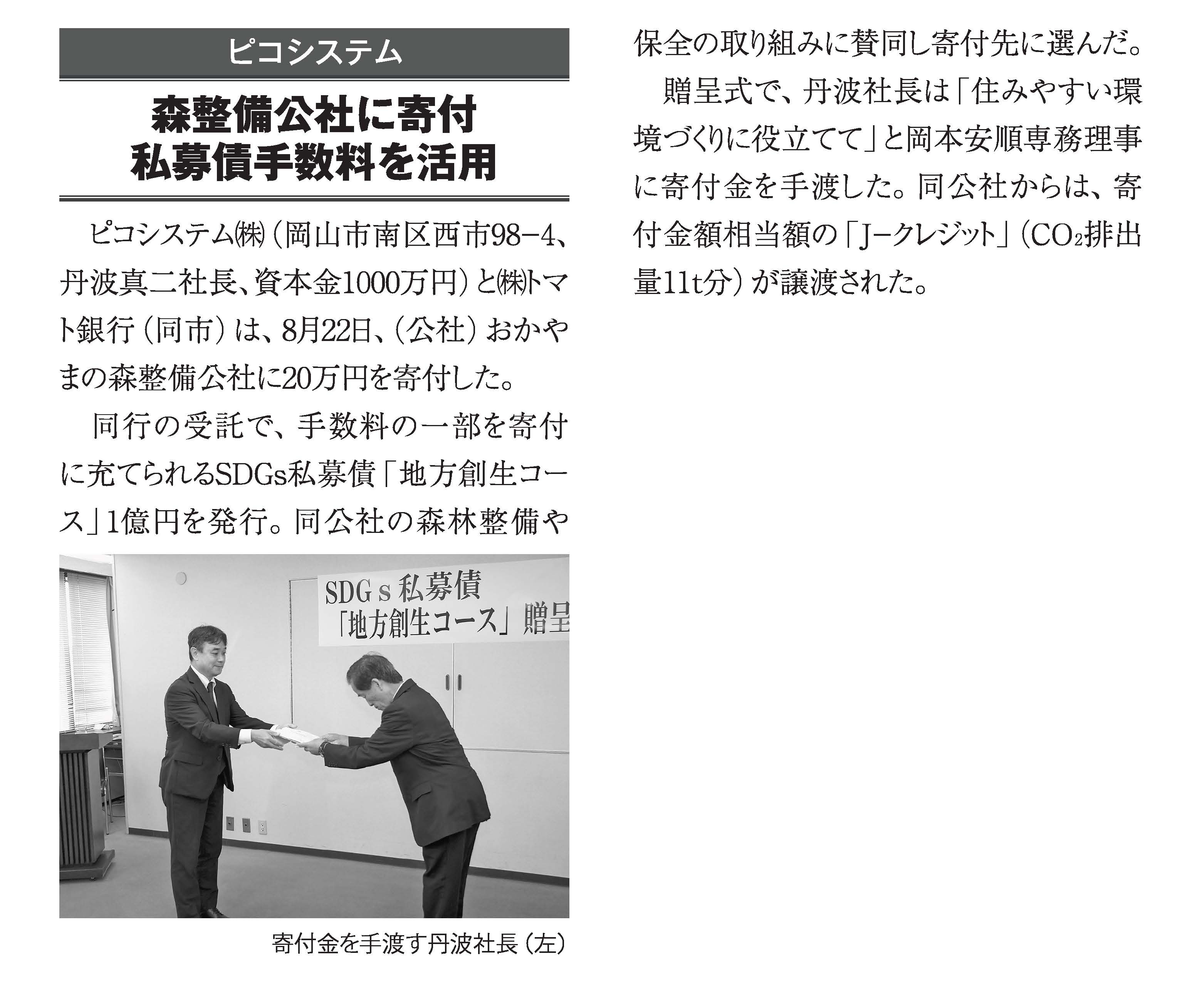 ピコシステム(株)(岡山市南区西市98-4、丹波真二社長、資本金1000万円)と(株)トマト銀行(同市)は、8月22日、(公社)おかやまの森整備公社に20万円を寄付した。