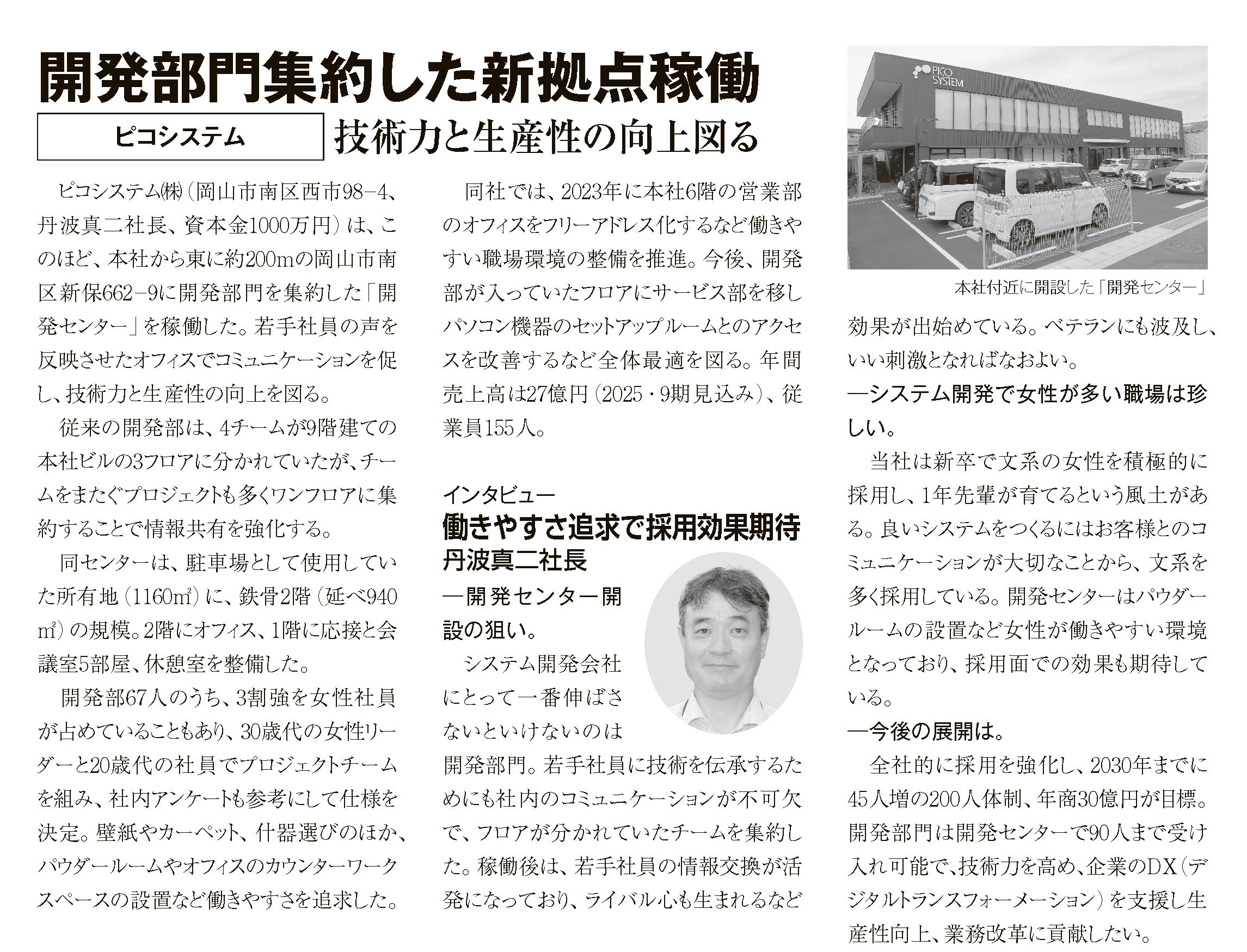 メディア掲載 2025.09.10 VISION OKAYAMA〔2025年9月15日号〕に弊社の記事が掲載されました VISION OKAYAMA〔2025年9月15日号〕に、当社の開発センターにする記事が掲載されました。 以下、抜粋 〓〓〓〓〓〓〓〓〓〓〓〓〓〓〓〓〓〓〓〓〓〓〓〓〓〓〓〓〓〓〓〓〓〓〓〓〓 開発部門集約した新拠点/稼働ピコシステム技術力と生産性の向上図る ピコシステム㈱(岡山市南区西市98-4、丹波真二社長、資本金1000万円)は、このほど、本社から東に 約200mの岡山市南区新保662-9に開発部門を集約した「開発センター」を稼働した。若手社員の声を反映 させたオフィスでコミュニケーションを促し、技術力と生産性の向上を図る。 従来の開発部は、4チームが9階建ての本社ビルの3フロアに分かれていたが、チームをまたぐプロジェクト も多くワンフロアに集約することで情報共有を強化する。 同センターは、駐車場として使用していた所有地(1160㎡)に、鉄骨2階(延べ940㎡)の規模。 2階にオフィス、1階に応接と会議室5部屋、休憩室を整備した。 開発部67人のうち、3割強を女性社員が占めていることもあり、30歳代の女性リーダーと20歳代の社員で プロジェクトチームを組み、社内アンケートも参考にして仕様を決定。壁紙やカーペット、什器選びのほか、 パウダールームやオフィスのカウンターワークスペースの設置など働きやすさを追求した。 同社では、2023年に本社6階の営業部のオフィスをフリーアドレス化するなど働きやすい職場環境の整備を推進。 今後、開発部が入っていたフロアにサービス部を移しパソコン機器のセットアップルームとのアクセスを改善する など全体最適を図る。年間売上高は27億円(2025・9期見込み)、従業員155人。 <インタビュー> 【働きやすさ追求で採用効果期待/丹波真二社長】 ―開発センター開設の狙い。 システム開発会社にとって一番伸ばさないといけないのは開発部門。若手社員に技術を伝承するためにも社内の コミュニケーションが不可欠で、フロアが分かれていたチームを集約した。稼働後は、若手社員の情報交換が 活発になっており、ライバル心も生まれるなど効果が出始めている。ベテランにも波及し、いい刺激となればなおよい。 ―システム開発で女性が多い職場は珍しい。 当社は新卒で文系の女性を積極的に採用し、1年先輩が育てるという風土がある。良いシステムをつくるには お客様とのコミュニケーションが大切なことから、文系を多く採用している。開発センターはパウダールームの設置など 女性が働きやすい環境となっており、採用面での効果も期待している。 ―今後の展開は。 全社的に採用を強化し、2030年までに45人増の200人体制、年商30億円が目標。開発部門は開発センターで90人まで 受け入れ可能で、技術力を高め、企業のDX(デジタルトランスフォーメーション)を支援し生産性向上、業務改革に貢献したい。 〓〓〓〓〓〓〓〓〓〓〓〓〓〓〓〓〓〓〓〓〓〓〓〓〓〓〓〓〓〓〓〓〓〓〓〓〓 ※VISION OKAYAMA 2025年9月15日 <prev next> 一覧へ戻る