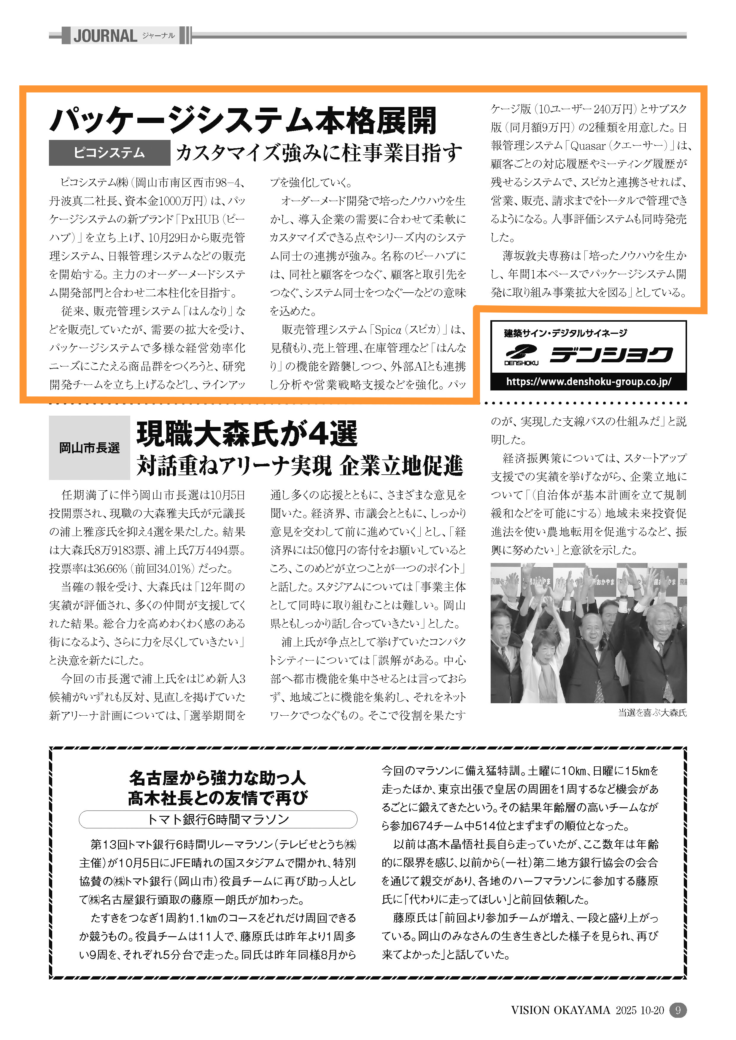 メディア掲載 2025.10.16 VISION OKAYAMA〔2025年10月20日号〕に弊社の記事が掲載されました VISION岡山〔2025年10月20日号〕に、弊社パッケージシステムに関する記事が掲載されました。 以下、抜粋 〓〓〓〓〓〓〓〓〓〓〓〓〓〓〓〓〓〓〓〓〓〓〓〓〓〓〓〓〓〓〓〓〓〓〓〓〓 パッケージシステム本格展開 ―カスタマイズ強みに柱事業目指すー ピコシステム㈱(岡山市南区西市98-4、丹波真二社長、資本金1000万円)は、パッケージシステムの新ブランド「PxHUB(ピーハブ)」を立ち上げ、10月29日から販売管理システム、日報管理システムなどの販売を開始する。主力のオーダーメードシステム開発部門と合わせ二本柱化を目指す。 従来、販売管理システム「はんなり」などを販売していたが、需要の拡大を受け、パッケージシステムで多様な経営効率化ニーズにこたえる商品群をつくろうと、研究開発チームを立ち上げるなどし、ラインアップを強化していく。 オーダーメード開発で培ったノウハウを生かし、導入企業の需要に合わせて柔軟にカスタマイズできる点やシリーズ内のシステム同士の連携が強み。名称のピーハブには、同社と顧客をつなぐ、顧客と取引先をつなぐ、システム同士をつなぐ―などの意味を込めた。 販売管理システム「Spicα(スピカ)」は、見積もり、売上管理、在庫管理など「はんなり」の機能を踏襲しつつ、外部AIとも連携し分析や営業戦略支援などを強化。パッケージ版(10ユーザー240万円)とサブスク版(同月額9万円)の2種類を用意した。日報管理システム「Quasar(クエーサー)」は、顧客ごとの対応履歴やミーティング履歴が残せるシステムで、スピカと連携させれば、営業、販売、請求までをトータルで管理できるようになる。人事評価システムも同時発売した。 薄坂敦夫専務は「培ったノウハウを生かし、年間1本ペースでパッケージシステム開発に取り組み事業拡大を図る」としている。 〓〓〓〓〓〓〓〓〓〓〓〓〓〓〓〓〓〓〓〓〓〓〓〓〓〓〓〓〓〓〓〓〓〓〓〓〓 ※VISION岡山 2025年10月20日 <prev next> 一覧へ戻る