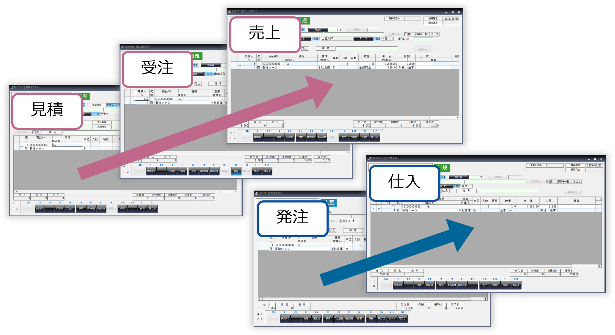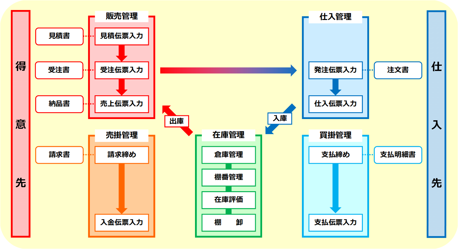 見積→受注→売上や発注→仕入へデータ連動可能、入力の手間を削減し、エラーチェック機能にて入力時の不整合や不足項目を検知し、ミスを防止します。