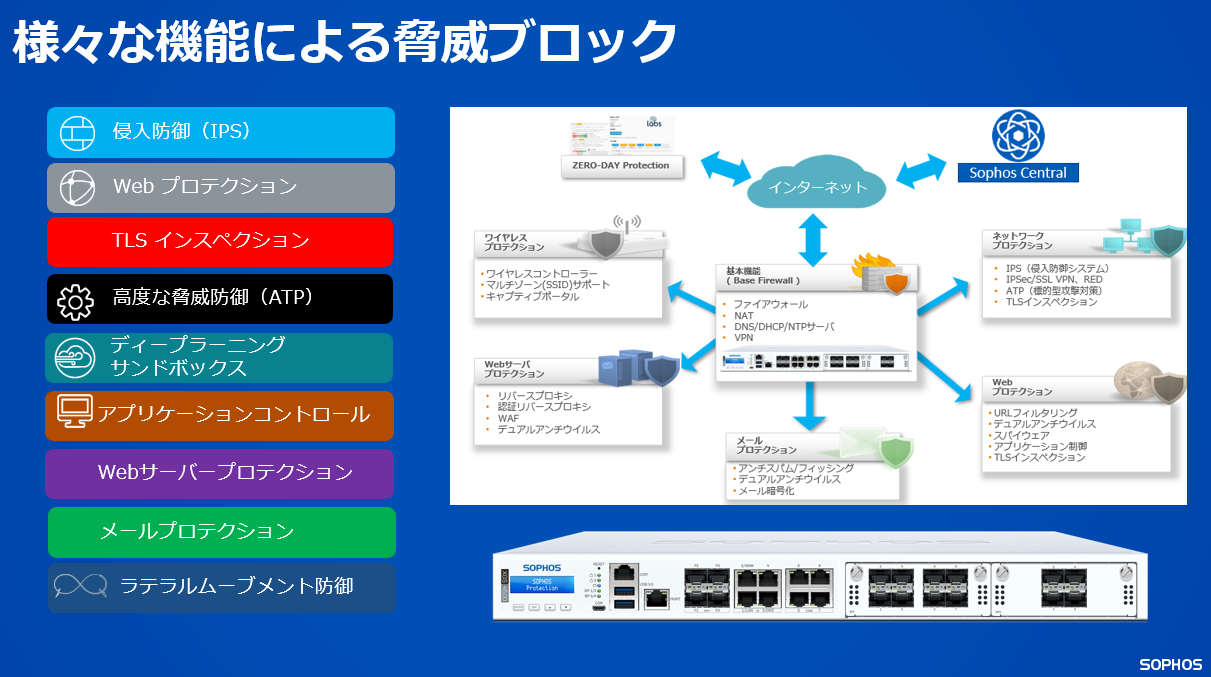 Sophos Firewall XGSシリーズは、高度な脅威からネットワークを保護するための次世代ファイアウォールです。SSL/TLS暗号化トラフィックの可視化や、IPS/IDS、アプリケーション制御、URLフィルタリングなど、包括的なセキュリティ機能を提供します。
