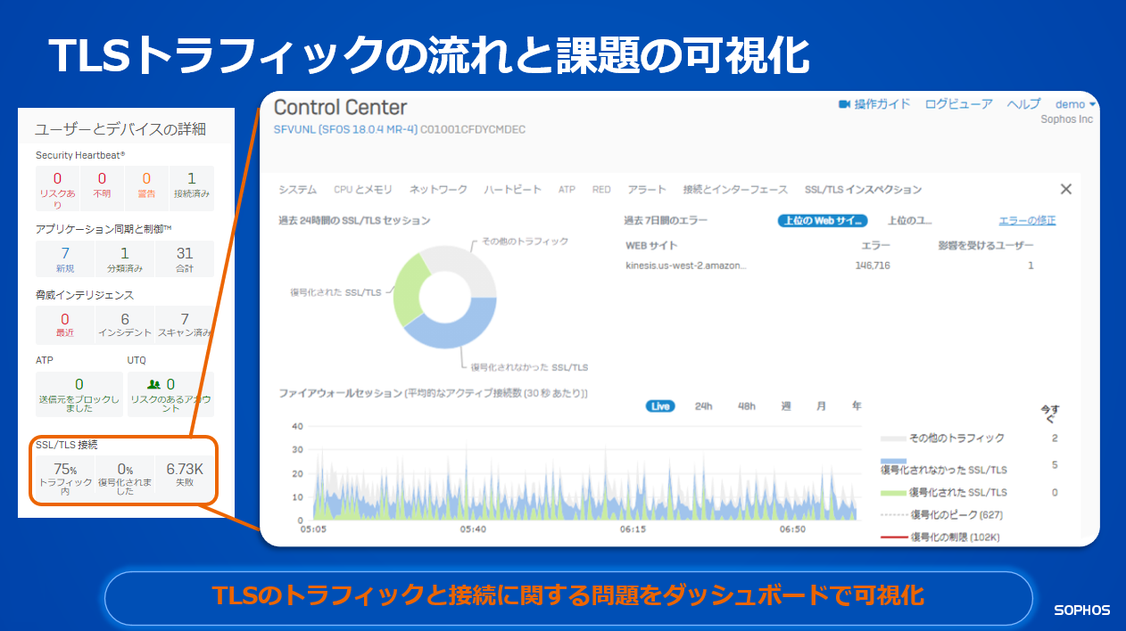 ソリューション:Sophos Firewall には、最新の高度な保護テクノロジーと TLS 1.3 や DPI インスペクション、機械学習、クラウドサンドボックスなど、脅威インテリジェンスが含まれています。プログラム可能なXstream Flow プロセッサは、重要なトラフィックフローの負荷を軽減し、暗号化されたトラフィックインスペクション、VPN およびアプリケーションルーティングを高速化するため、パフォーマンスを妥協する必要はありません。