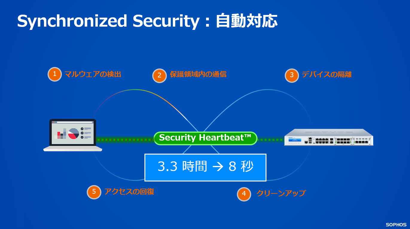また、Intercept X と連携させることで、脅威を検出したエンドポイントを瞬時にネットワーク隔離、駆除、ネットワーク復旧まで、自動で行える Synchronized Security で、脅威が他のエンドポイントに広がることを阻止します。